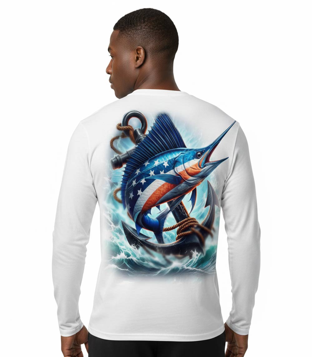 - Description: Men's Performance Long Sleeve Crew Neck Fish Design with USA Flag